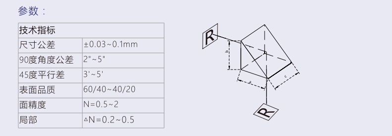 直角棱鏡通常用于將光路進行90度轉(zhuǎn)折,根據(jù)棱鏡方位,像面可被反向,而左右不發(fā)射變化。如果一個直角棱鏡旋轉(zhuǎn)90度,通過棱鏡觀察像面將會成正立的,但是左右會反向。直角棱鏡也可以用于膠合分光鏡,通過鍍分光膜可實現(xiàn)分光效果,以及偏振分光。