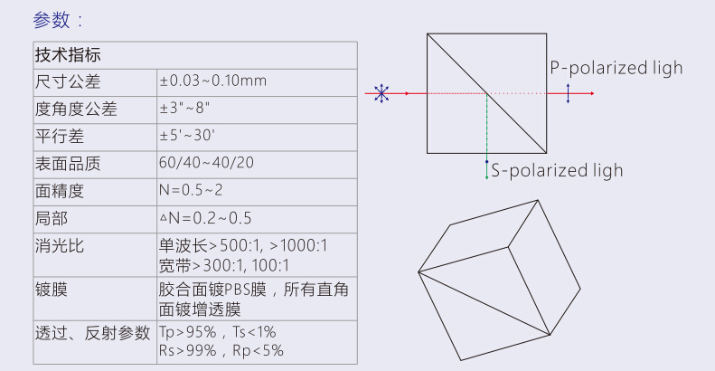 偏振分光棱鏡能把入射的非偏振光分成兩束垂直的線偏光。其中P偏光完全通過(guò),而S偏光以45度角被反射,出射方向與P光成90度角。此偏振分光棱鏡由一對(duì)高精度直角棱鏡膠合而成,其中一個(gè)棱鏡的斜邊上鍍有偏振分光介質(zhì)膜。