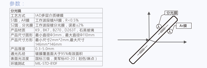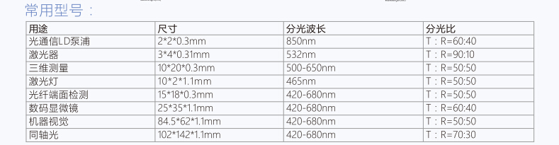 平面分光鏡在光路中起到分離光源能量和改變光路方向作用,結(jié)構(gòu)設(shè)計(jì)比較簡(jiǎn)單,光吸收小,分光后光損耗小等優(yōu)點(diǎn),激埃特分光鏡的特點(diǎn)是平坦的全介質(zhì)膜分光比和背面有30弧分的楔面以及超好的增透減反效應(yīng),確保不重影和雜散光出現(xiàn)。廣泛在顯微成像、機(jī)器視覺、激光分束、3D合成領(lǐng)域得到良好的應(yīng)用。